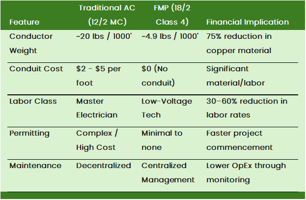The financial advantage of FMP is primarily realized through the reduction of "copper intensity" and the elimination of mechanical protection. Because Class 4 systems are inherently safe, they do not require conduit and can be installed using Ethernet-like wiring methods.25