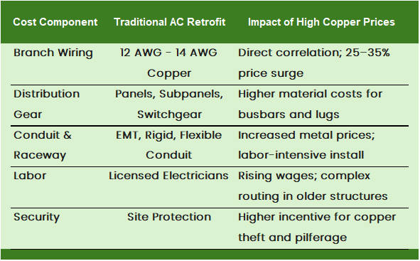 Conventional commercial wiring methods are inherently copper-dependent. Most consultants specify THHN/THWN conductors in 100% copper for branch circuits to ensure conductivity and durability.19 The financial impact of copper price fluctuations is "outsized" because there is often no alternative material specified for these circuits in traditional designs.2