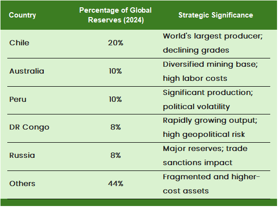 The geopolitical risk to the copper supply chain is increased by the geographic concentration of both reserves and refining capacity. Over 50% of global copper reserves are located in just five countries: Chile, Australia, Peru, the Democratic Republic of the Congo, and Russia.15
