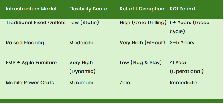 The transition toward "Agile Workplaces" reflects a shift in organizational culture toward flexibility, collaboration, and high-velocity work processes.35 Central to this shift is the decoupling of the worker from fixed building infrastructure, particularly the "floor box" electrical outlet.37