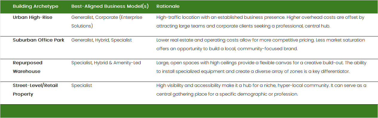 Traditional Office Buildings: Their pre-existing infrastructure and rigid, structured layouts make them a straightforward fit for the Generalist and corporate-focused models.4 These buildings are easily configured with a high ratio of private offices and dedicated desks, which are the bread and butter of these models.13