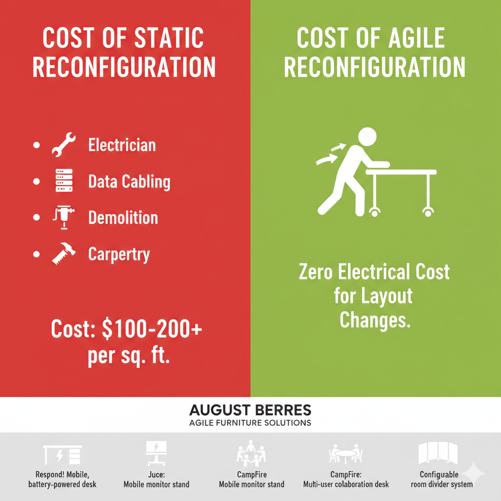 Eliminating the CapEx Tax of Inflexibility: In traditional offices, changing a layout means a costly, multi-trade renovation—tearing up floors and pulling new conduit for fixed power. This typically costs $60 to $200+ per square foot and locks the space into a permanent, quickly outdated configuration. However, by embracing solutions for the Agile Workplace, the CapEx dynamic is transformed. Deploying flexible battery-powered furniture means the space can be reconfigured overnight, without an electrician. This eliminates the multi-year, multi-million-dollar future cost of layout changes, essentially future-proofing your tenant relationships from expensive operational disruption.
