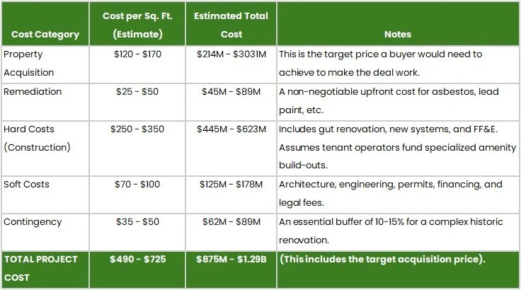 With a potential all-in cost approaching or exceeding $1 Billion, how does an investor hit a 15-20% return? We do it by working backward from the building's future value after it’s fully renovated and leased up.